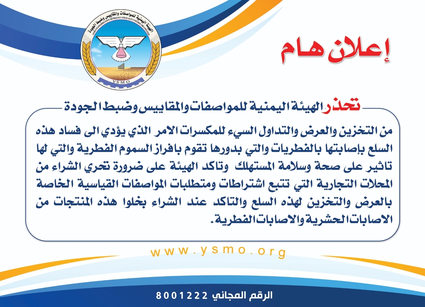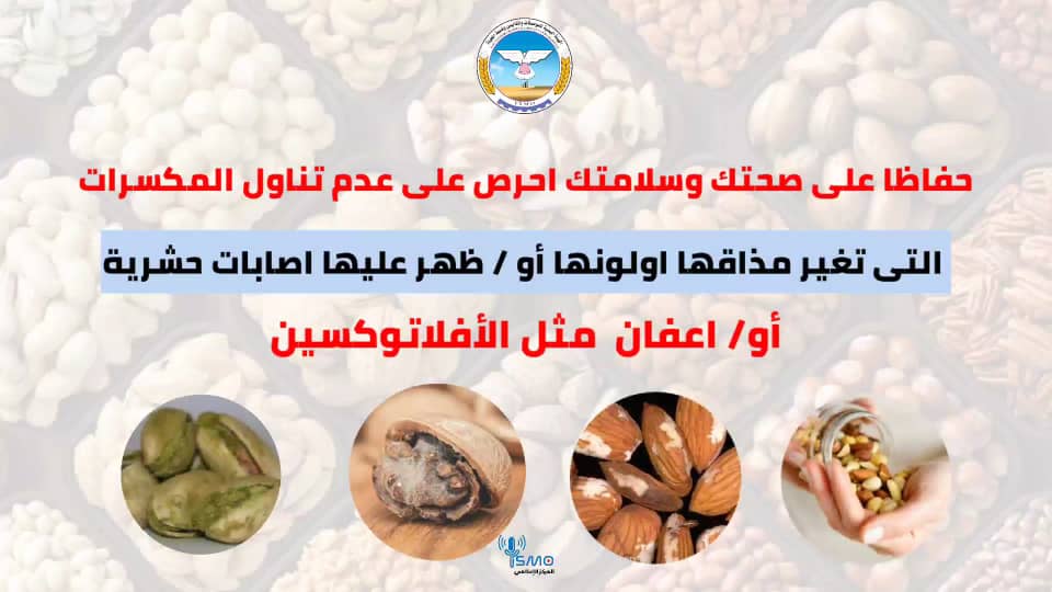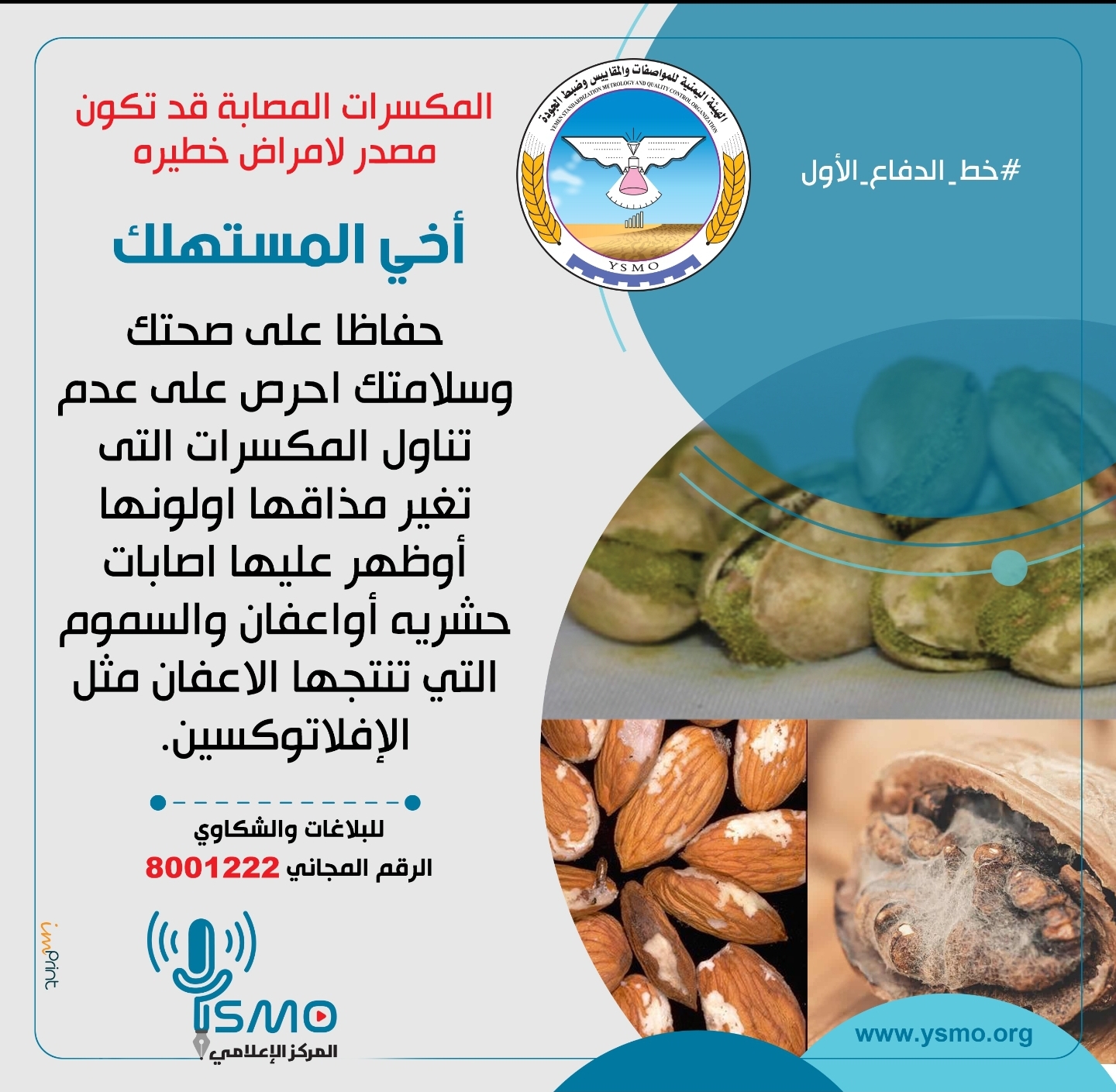 حذرت الهيئة اليمنية للمواصفات والمقاييس وضبط الجودة من التخزين والعرض السيئ للمكسرات. وأوضحت الهيئة في بلاغ صادر عنها اليوم أن التخزين والعرض السيئ للمكسرات يؤدي إلى فساد هذه السلع بإصابتها بالفطريات والتي بدورها تقوم بإفراز السموم الفطرية بما يؤثر على صحة وسلامة المستهلك عند تناولها وتتسبب في الإصابة ببعض الأمراض الخطيرة. وشددت الهيئة على ضرورة التزام كافة المحلات باشتراطات التخزين والنقل والعرض لهذه السلعة وحفظها وتخزينها في درجة حرارة منخفضة لضمان سلامتها من التعفن وغيره. ودعت الهيئة المستهلكين إلى التأكد عند الشراء من خلو هذه المنتجات من الإصابات الحشرية والفطرية وتجنب الشراء من الباعة المتجولين والتخلص منها في حالة ظهور إصابات حشرية أو سموم فطرية أو مخلفات القوارض.