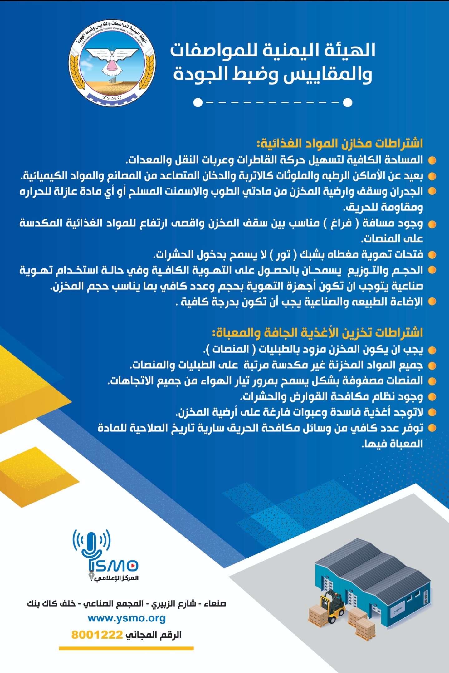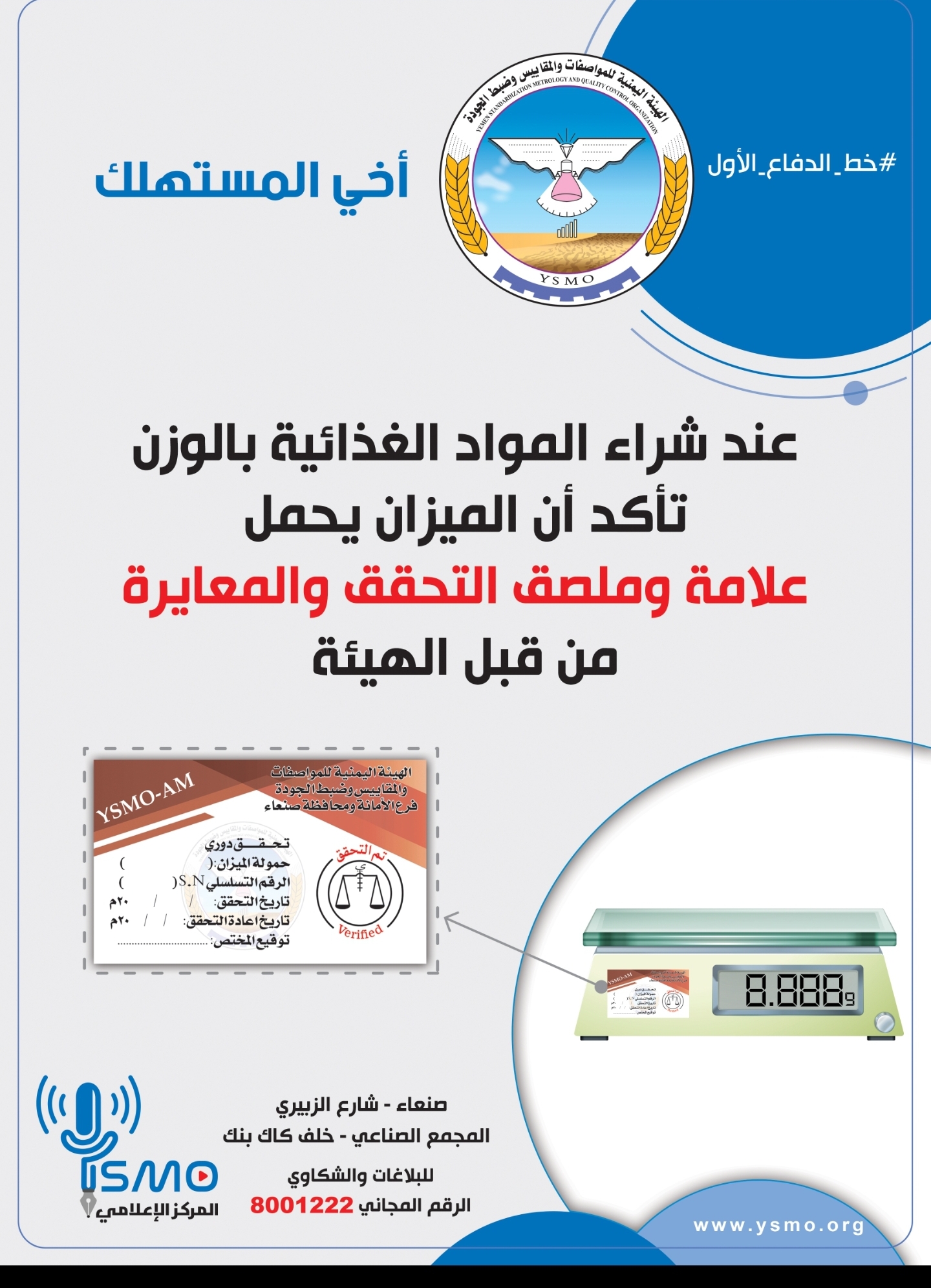 صنعاء. 21 رمضان 1445ه.الموافق 31 مارس 2024م تنفيذا لتوجيهات مدير عام الهيئة التنفيذي أ / سام أحمد البشيري نفذت الهيئة اليمنية للمواصفات والمقاييس وضبط الجودة برنامج حملة المسح الميدانى للرقابة والتفتيش والتوعية على السلع والمواد الاستهلاكية في المحلات والمخازن التجارية في امانة العاصمةصنعاء والمحافظات. وأوضح مدير عام الهيئة سام أحمد البشيري ان النزول الذي تنفذه لجان رئيسة وفرعية بأمانة العاصمة والمحافظات في اطار خطة الهيئة لتفعيل الرقابة على محلات الجملة ومخازن المستوردين للمنتجات الاستهلاكية والتأكد من تطبيق الاشتراطات الخاصة بأساليب العرض والتخزين للمواد والسلع الغذائية، وضمان عرضها وتخزينها بطرق آمنة وصحيحة وفقا لاشتراطات المواصفات القياسية المعتمده. وأشار إلى أن النزول الذي سيتم تنفيذه على مدى عشرة ايام يتضمن ايضا الجانب التوعوي وذلك من خلال توزيع اللوحات الإرشادية والتوعوية الخاصة باشتراطات مخازن المواد الغذائية وتخزين الأغذية الجافة والمعباة وغيرها من الرسائل التوعوية والتثقيفية الهادفة إلى رفع مستوى الوعي بأهمية تطبيق اشتراطات المواصفات القياسية لدى التاجر والمستورد وتعزيزالثقافةالاستهلاكيةلدى المستهلك. وشدد على أهمية مضاعفة الجهود من قبل فرق النزول الميدانية بما ينعكس على نجاح الحمله وتحقيق أهدافها المتمثلة بحماية المستهلك من أساليب التلاعب والغش . ________________________ للشكاوي والبلاغات الاتصال على الرقم المجاني 8001222 للاشتراك ف بصفحاتنا الرسمية على منصات التواصل الاجتماعي والموقع الرسمي الإلكتروني: ??الموقع الرسمي ysmo.org ??تويتر: twitter.com/YSMOORG ??اليوتيوب : youtube.com/@YsmoYemen ??الفيس بوك: fb.me/YSMO.ORG ??تيليجرام:t.me/ysmo1 _________________________________ #خط_الدفاع_الاول الهيئة اليمنية للمواصفات والمقاييس وضبط الجودة