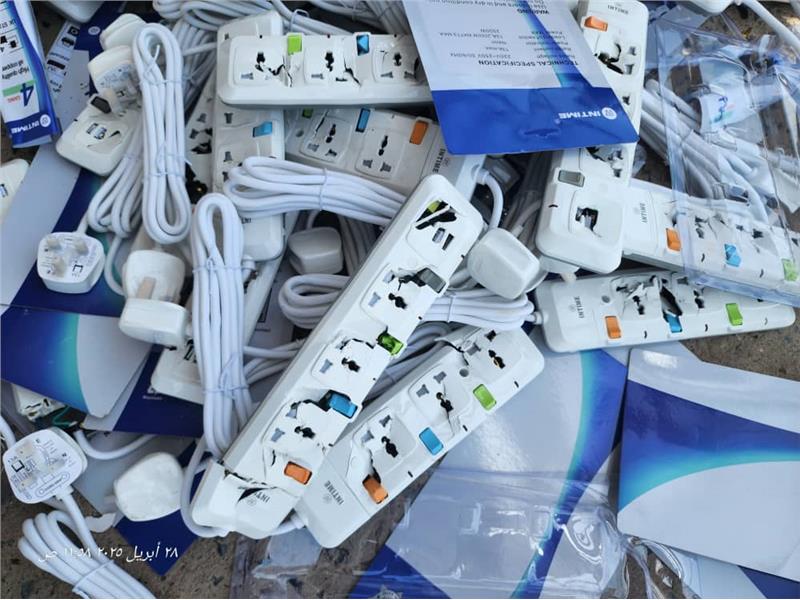 - إتلاف : توصيلات كهربائية +افياش (مقابس ). - الكمية: 77 توصيلة + 109 افياش (مقابس ). - بلد المنشأ : الصين - تنفيذ : فرع الهيئة بمحافظة الحديدة بالتعاون مع الجمارك والجهات الأمنية. - سبب الإتلاف: غير مطابقة للمواصفات القياسية المعتمدة من حيث عدم وجود غوالق حماية ، والمقابس متعددة الفتحات والبنان ليس من النحاس.