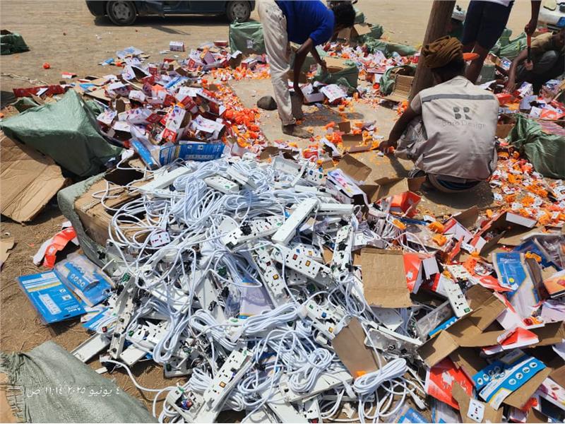 - إتلاف : توصيلات كهربائية وقابسات ومقابس كهربائية مشتركة (ثنائي متعدد الفتحات) . - الكمية : 23040 قطعة . - بلد المنشأ : الصين . - تنفيذ : فرع الهيئة بمحافظة الحديدة بالتعاون مع جمارك الميناء والجهات الأخرى ذات العلاقة والاختصاص. - سبب الإتلاف : تبين مخالفتها للمواصفات القياسية المعتمدة من حيث وجود خط ثالث وهمي وشكل الفتحات متعدد ولا يوجد بنان ثالث ارضي والمقبس ثنائي متعدد الفتحات.