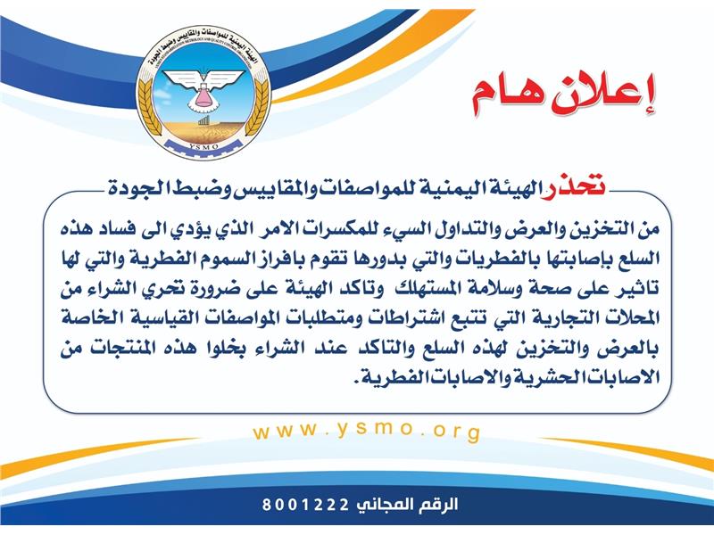 تحذر الهيئة اليمنية للمواصفات والمقاييس وضبط الجودة. من التخزين والعرض والتداول السيء للمكسرات الأمر الذي يؤدي الى فساد هذه السلع بإصابتها بالفطريا إقراء المزيد