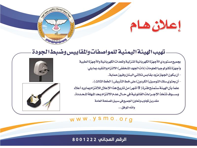 تهيب الهيئة اليمنية للمواصفات والمقاييس وضبط الجودة بجميع مستوردي الأجهزة الكهربائية المنزلية والمعدات الكهربائية والأجهزة الطبية وأجهزة تكنولوجيا إقراء المزيد