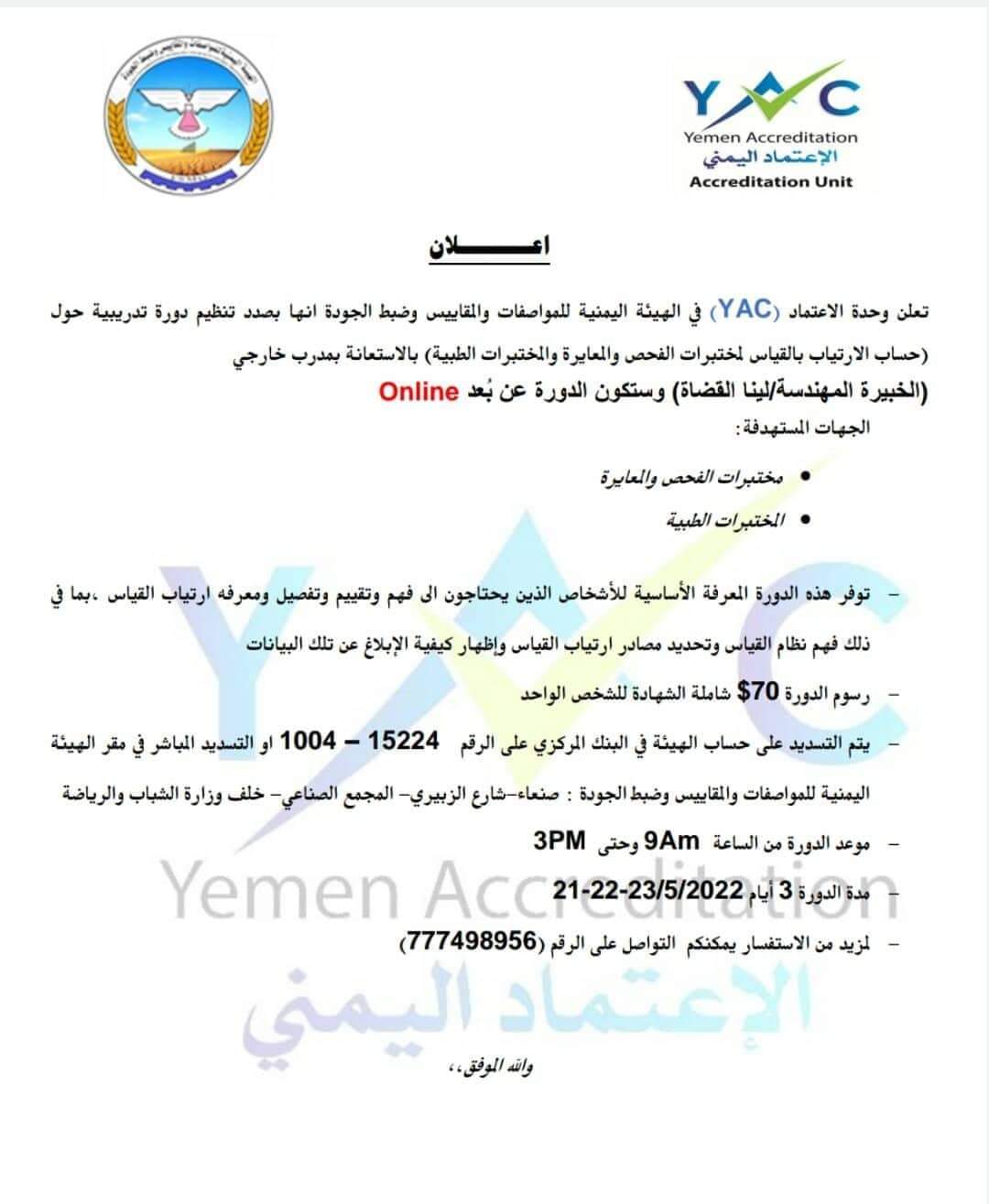 صنعاء 21 - 23 مايو2022م.المركز الإعلامي. نظمت الهيئة اليمنية للمواصفات والمقاييس وضبط الجودة - وحدة الإعتماد دورة تدريبية في مجال حساب ا?رتياب في ال إقراء المزيد