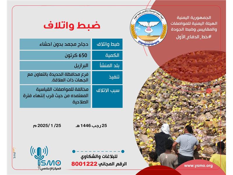 #المركز_الإعلامي: ــــــــــــــــــــــــــــــــــــــــــــــــ - إتلاف : دجاج مجمد بدون احشاء - الكمية : 650 كرتون - بلد المنشأ : ال إقراء المزيد