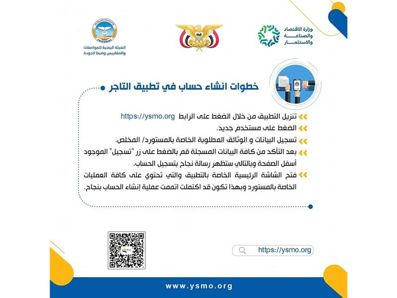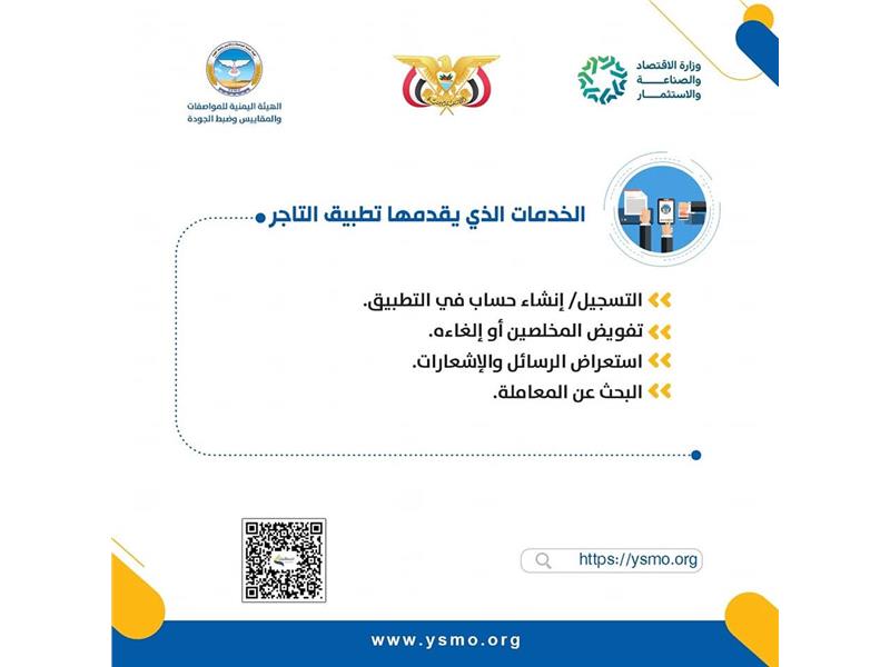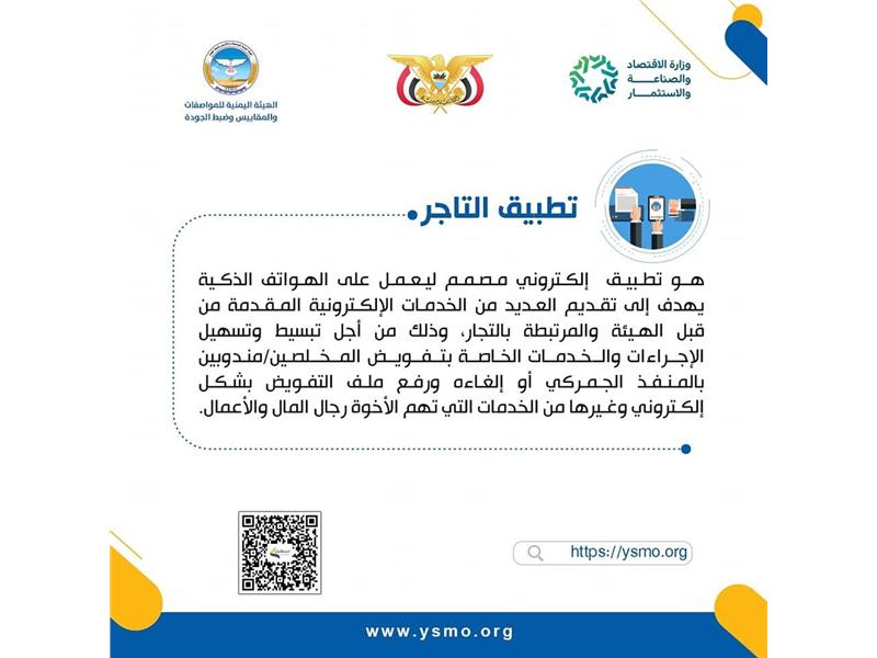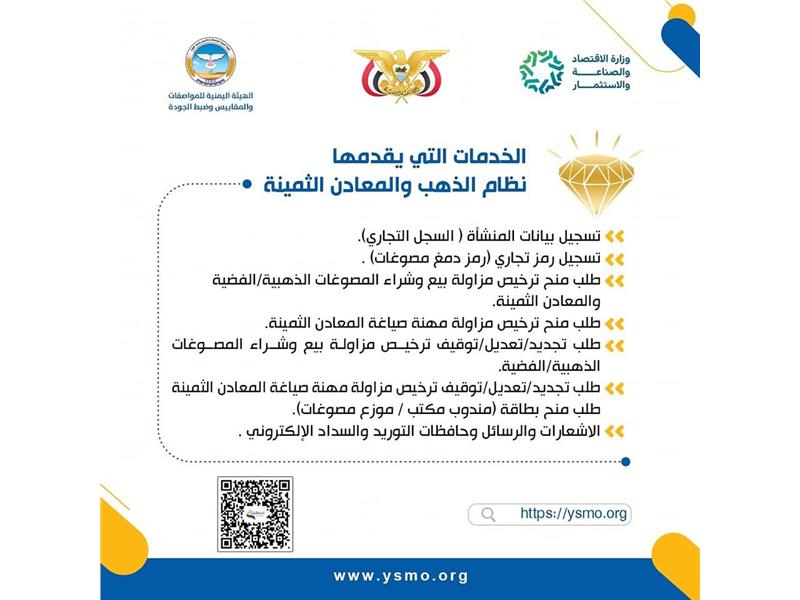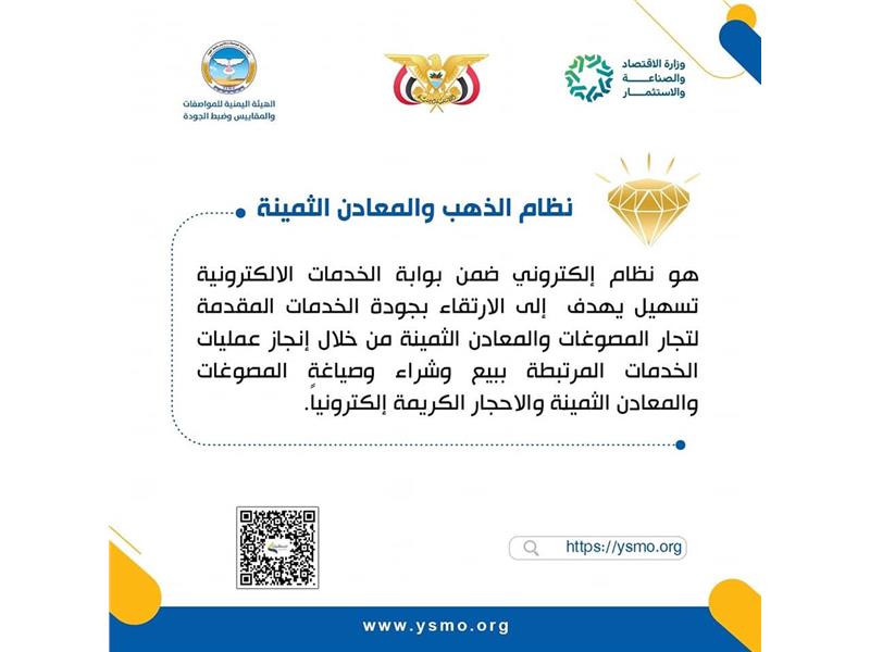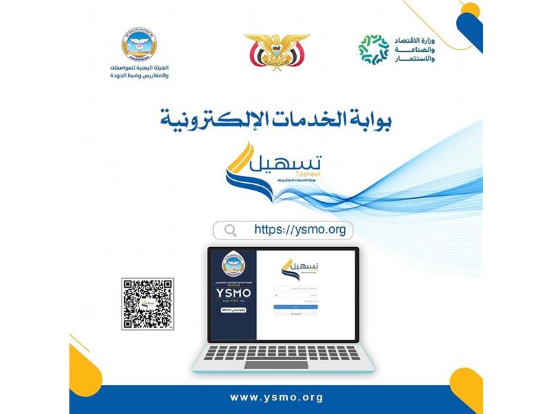 بوابة لجميع الخدمات الإلكترونية التي تقدمها الهيئة اليمنية للمواصفات والمقاييس وضبط الجودة وتندرج تحتها عددا من الأنظمة والتطبيقات إقراء المزيد