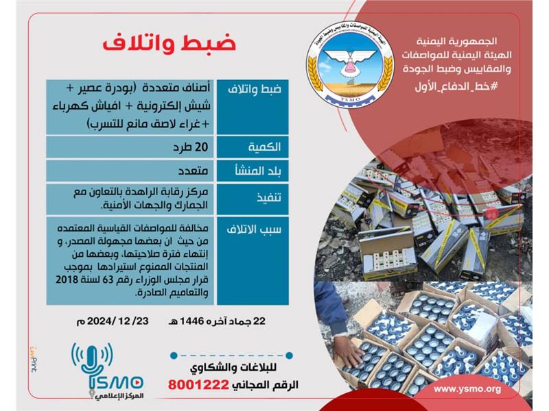 إتلاف: أصناف متعددة (بودرة عصير + شيش إلكترونية + افياش كهرباء +غراء لاصق مانع للتسرب). - الكمية: 20 طرد - بلد المنشأ : متعدد - سبب الإتلاف إقراء المزيد