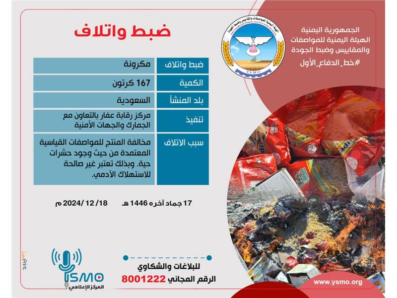 إتلاف : مكرونة - الكمية: 167 كرتون - بلد المنشأ : السعودية - تنفيذ : مركز رقابة عفار بالتعاون مع الجمارك والجهات الأمنية. - سبب الإتلاف: إقراء المزيد