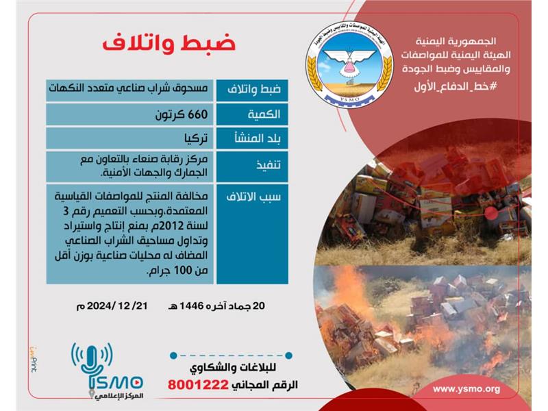 إتلاف : مسحوق شراب صناعي متعدد النكهات - الكمية: 660 كرتون - بلد المنشأ : تركيا - تنفيذ : مركز رقابة صنعاء بالتعاون مع الجمارك والجهات الأم إقراء المزيد