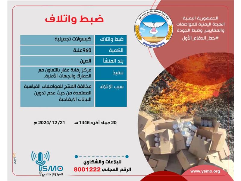إتلاف : كبسولات تجميلية - الكمية: 960علبة - بلد المنشأ : الصين - تنفيذ : مركز رقابة عفار بالتعاون مع الجمارك والجهات الأمنية. - سبب الإت إقراء المزيد